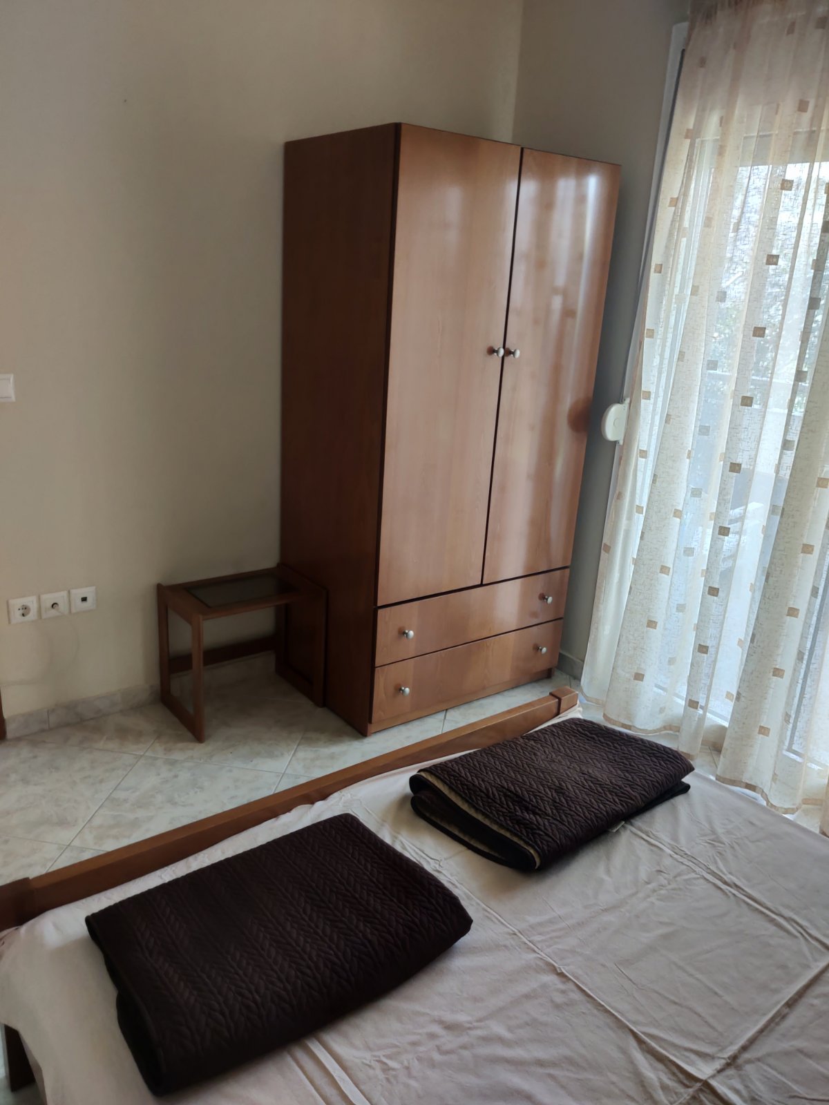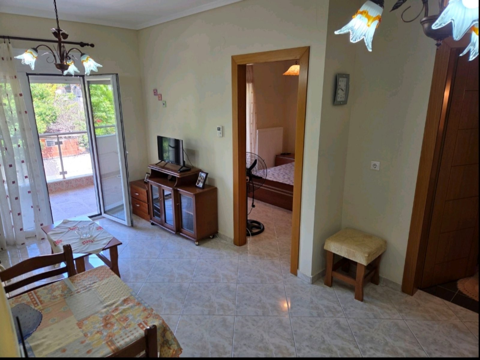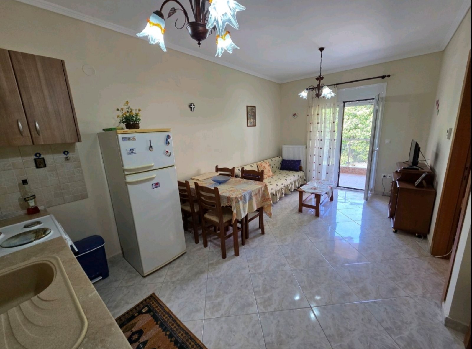 Apartman HARIS se nalazI u centru Nea Kalikratije, u ulici koja je paralelna sa glavnom pešačkom zonom i koja se spušta ka moru i plaži. Od mora i gradske plaže je udaljena oko 250 metara. Apartman se nalazi na prvom spratu zgrade koja je namenski izgrađena za izdavanje stanova i apartmana i ima terasu sa pogledom ka dvorištu i parking prostoru koji je dostupan gostima apartmana. Sastoje se od dnevnog boravka sa prostranom kuhinjom, spavaće sobe sa bračnim ležajem, kupatila i terase na koju se izlazi iz dnevnog boravka i spavaće sobe. U dnevnom boravku se nalaze dva kauča na razvlačenje i kuhinja opremljena šporetom, velikim frižiderom i posuđem neophodnim za pripremanje hrane. Kuhinja ima i trpezarijski sto za četiri osobe. Kupatilo je sa tuš kadom a ima i mašinu za pranje veša. Apartman poseduje TV aparat i klima uređaj u dnevnom boravku. Korišćenje klima uređaja je uključeno u cenu najma apartmana. Objekat poseduje wi-fi internet konekciju a u dvorištu objekta je parking prostor (korišćenje bez naplate).